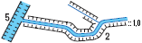 Каналізовані ділянки річок, канали і канави у виїмках, що виражаються в масштабі карти з однієї та з двох сторін (5 і 2 - глибина виїмки в м) |