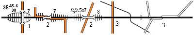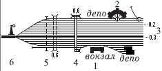 Депо, вокзали (1), поворотні круги (2), станційні колії (3), пішохідні мости (4), підземні переходи (5), семафори та світлофори (6) |